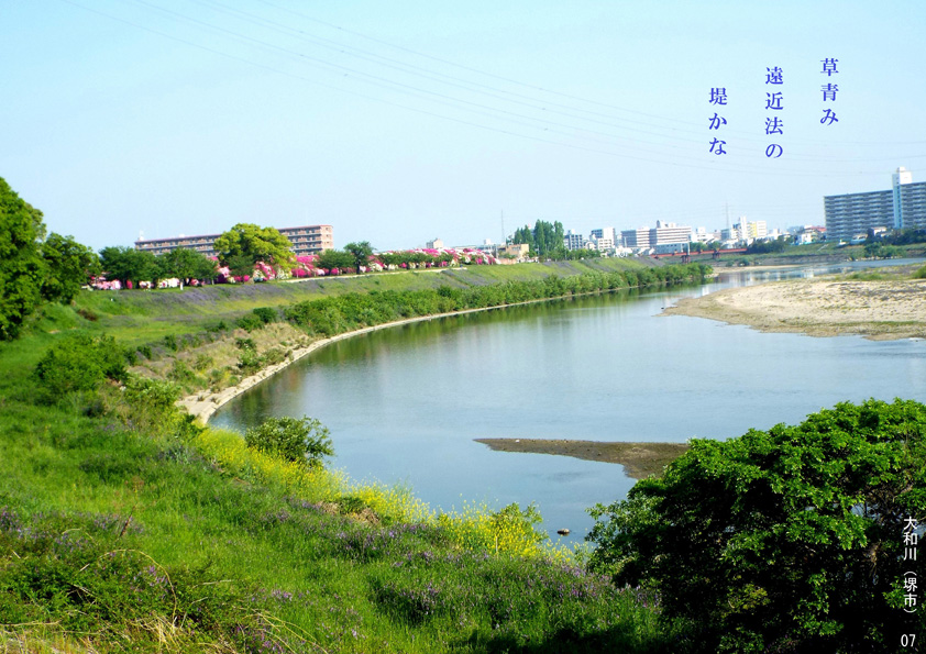 草青み遠近法の堤かな